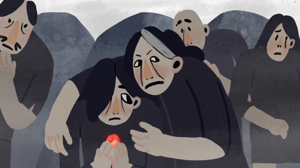 Na poli obklopenom skalami ťažko pracujú ľudia, ktorí dolujú červené drahokamy. Matka s dcérou nájdu jeden z nich a následne sa objaví starý autobus so „strážcom brány“, malým pánom v obleku. Ten odváža iba tých, čo vlastnia drahokam, k obrovskej kamennej hlave, bráne k údajnému raju. Dcéra však zistí, že hlava je nástrojom smrti v rukách mocných. V snahe zachrániť matku podpáli vnútro hlavy, no matka zomiera. Dcéra prežije, zničí hlavu a kráča sama do neznáma.